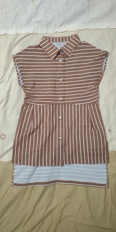Платье-туника коричневое в полоску размер 42 Бумажная бирка отсутствует. Застежка на пуговицах. Спереди короче, взади длиннее. Тканина тоненька, легенька.