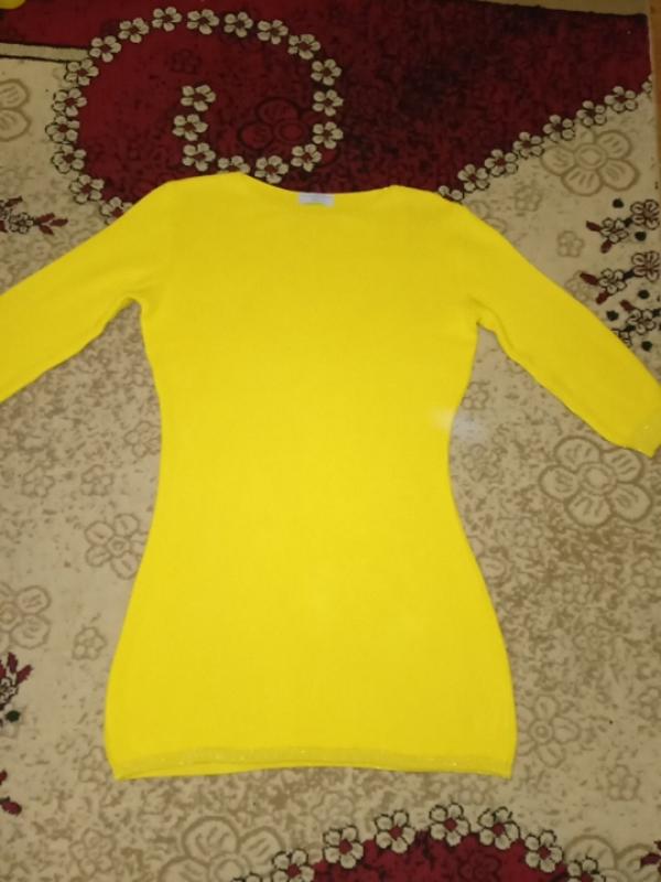 Вязаное платье,туника ярко - желтого цвета.Стан хорош.Размер 48.Ис нюансов только наличие нескольких микро зацепок (последнее фото). Длина 87см, плечи 47, пог55 см,пот 45 см.низ 52 см,рукав от плеча 47 см. Хорошо тянется.Дополнительные фото и замеры при необходимости дадам.Покупка делайте умеренно.Зажмите пожалуйста отклик о товаре и продавца.Успехах.