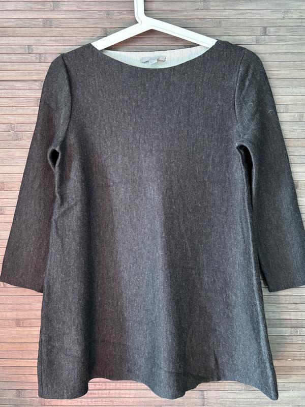 Гарна подовжена туніка, дуже приємна на дотик, вовна з домішками. Без етикеток. Ззовні сіра, всередині світла. Фасон трапеція, рукав вкорочений. Стан ідеальний. Пог 41, плечі 33, рукав 47, поб 58, довжина 67.