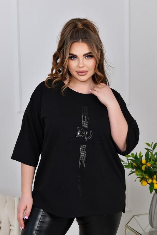 Туніка Код* 3643 Тканина: двонитка. Цвет: черный, салатовый, оранжевый, лиловый, фиолетовый, зеленый, желтый, белый, голубой, ярко синий, хаки. Размеры: 52-54, 56-58, 60-62, 64-66. Длина туники: 70, 71, 72, 73 см. Длина рукава: 50, 51, 52, 53 см. Обхват рукава: 44, 46, 48, 50 см. Замеры готового изделия: 52-54 ОГ 128 ОТ 128 ОС 128 56-58 ОГ 136 ОТ 136 ОС 136 60-62 ОГ 144 ОТ 144 ОС 144 64-66 ОГ 152 ОТ 152 ОС 152 Стильная повседневная туника из трикотажа двунитки ( растяжимость средняя). Силуэт туники прямой, свободный. Вырез горловины круглый. Линия плеча спущены, рукав длиной до локтя. По бокам небольшие разрезы. Туника декорирована стильной аппликацией из страз. Застежек, карманов нет.