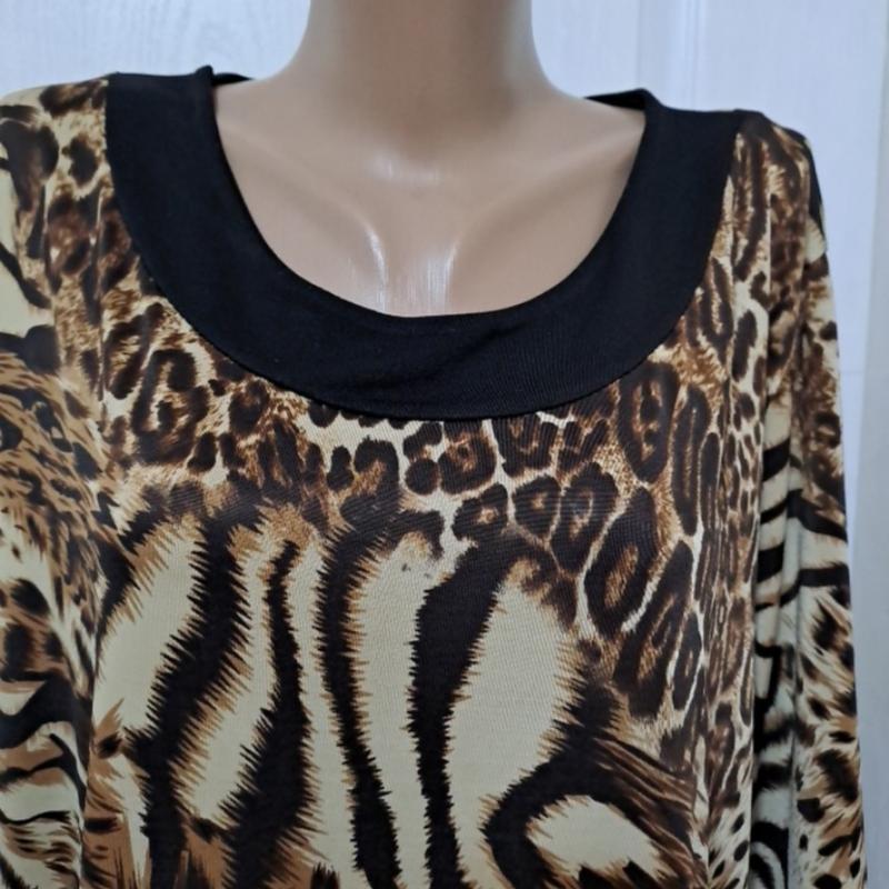 Шикарная туника, большого размера. Состояние новой. Фасон, расцветка, ткань и посадка- супер. Ткань хорошо тянется. Замеры: Длина- 93 см. ПОГ- 62 см. ПОБ- 64 см. Рукав от ворота- 50 см. В плечах - 46 см. Все замеры в спокойном состоянии ткани.