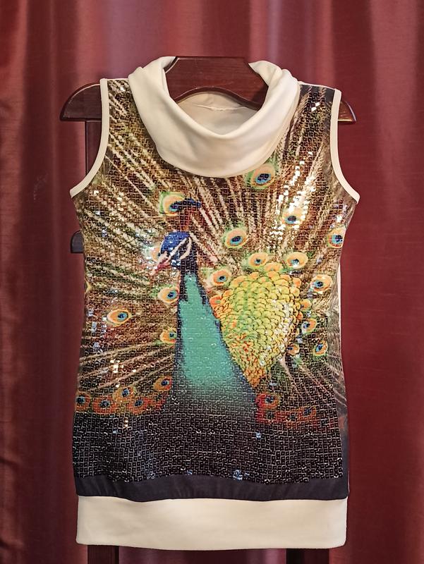 Трикотажная туника - безрукавка. спереди вышита пайетками в виде жароптики. Длина -71 см. Ширина в плечах - 39 см.