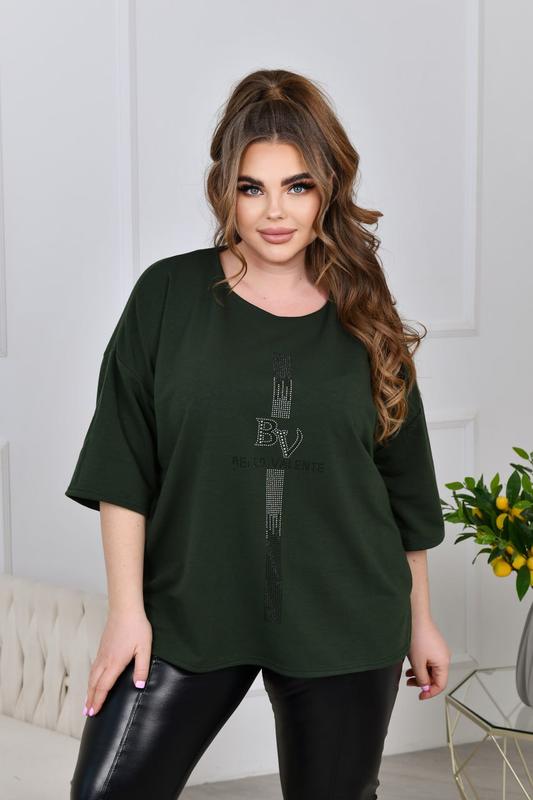 Туніка НОВИНКА💥💥💥 В НАЯВНОСТІ✅✅✅ Тканина: двонитка. Размеры: 52-54, 56-58, 60-62, 64-66. Длина туники: 70, 71, 72, 73 см. Длина рукава: 50, 51, 52, 53 см. Обхват рукава: 44, 46, 48, 50 см. Замеры готового изделия: 52-54 ОГ 128 ОТ 128 ОС 128 56-58 ОГ 136 ОТ 136 ОС 136 60-62 ОГ 144 ОТ 144 ОС 144 64-66 ОГ 152 ОТ 152 ОС 152 Стильная повседневная туника из трикотажа двунитки ( растяжимость средняя). Силуэт туники прямой, свободный. Вырез горловины круглый. Линия плеча спущены, рукав длиной до локтя. По бокам небольшие разрезы. Туника декорирована стильной аппликацией из страз. Застежек, карманов нет.
