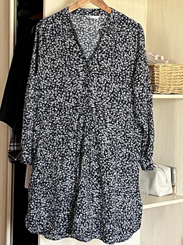 Стан ідеальний, бірки з складом немає, напевно поліестер, приємний тонкий матеріал в дрібну квітку, є куліска Пог60см Пот55см Пос65см Плече 14см Рукав60см Довжина 98см