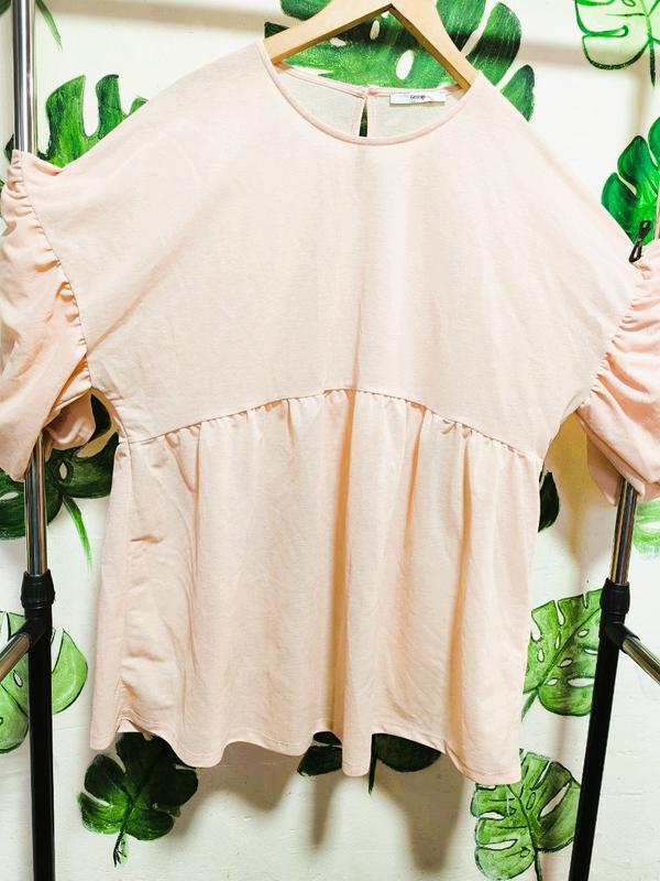 Интересная туника персикового цвета, рукава фонарики, свободная, стильная. Длина - 79см ПОГ - 60см ПОТ - 60 см Бедра - свободные Длина рукава от плеча - 42 см (на резинке)