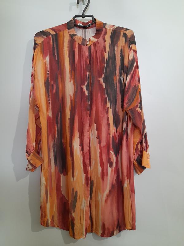 Стильное платье-халатик оверсайз от Mango. На пуговицах от верха до низа. Заниженная линия плеча. Воротник стойка. Материал: 100% вискоза. Размер: M, 170 см. Пог: 56 см. Рукав-реглан от воротника, длина: 71 см. Длина платья: 89 см.