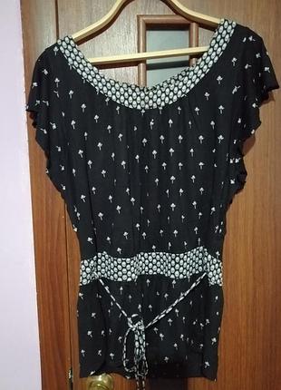 Туника черного цвета с цветами, фасон с оборой, ткань штатель