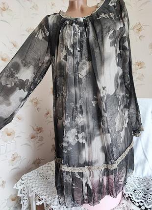 Шикарная итальянская шелковая туника с длинными широкими рукавами. Снизу майка из вискозы, тянется. Глубокий вырез декольте на резинке, обработан тесьмой с люрексом. Красивейший цветочный принт, в пастельных тонах. По низу широкая рюша, обшитая тесьмой. Рукав также украшен тесьмой. Смотрится очень эффектно и стильно. Состояние новой вещи без бирки. Следы ношения отсутствуют, дефектов нет.
