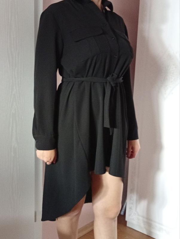 Пуговицы спереди; Нагрудные карманы; Пояс на талии; Асимметричный подол (коротче спереди, длиннее сзади); Длинные рукава на манжетах. Без дефектов