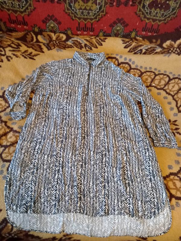 Женская весенне-летняя туника, из 100% вискозы ткань тянется, с отложным воротником и застежкой на молнии, с карманами по боковым швам, рукав длинный, но уменьшается, благодаря поясочке на пуговице, размер 50-54, замеры :Пог 70см, шейПот 70см, Поб 74см, плечи 45см, длина рукава от плеча 64см, длина переда от горловины 88см, длина по спине 103см, б/у, в идеальном состоянии без дефектов