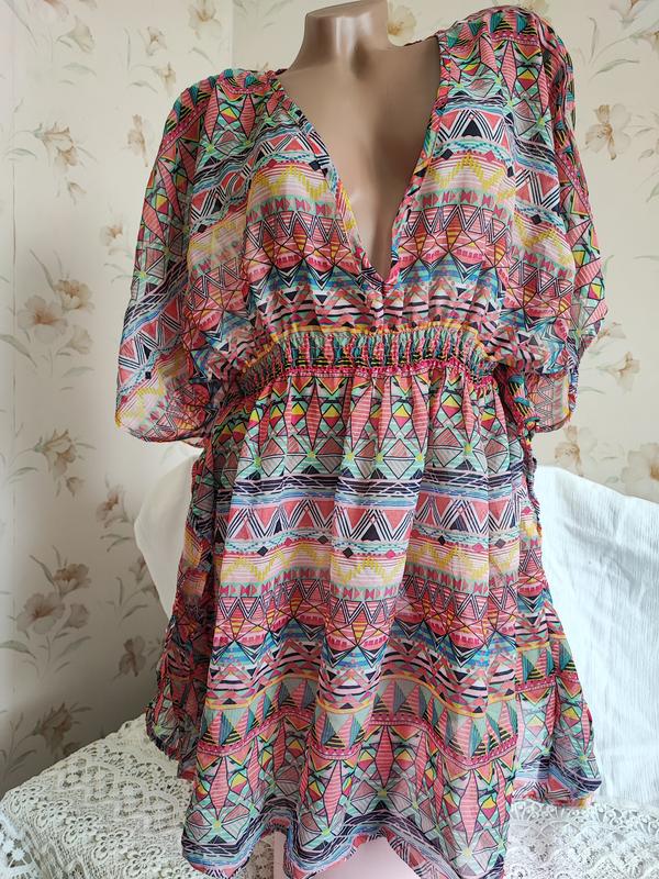 Лёгкая полупрозрачная туника с глубоким V-образным вырезом спереди. По спинке кокетливый разрез. В поясе на резинке. Рукав кимоно, спущенная пройма, до локтя. Принт в этностиле в пастельных тонах. Ткань искусственный шелк, приятная к телу. Смотрится очень эффектно. Состояние новой вещи, следы ношения отсутствуют.