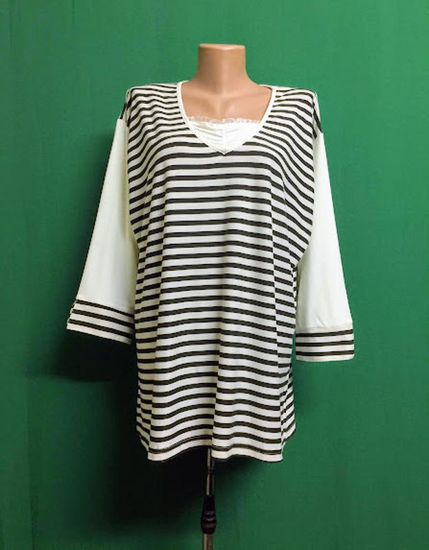 Туника Alfred Dunner - 68% Вискоза, 30% Коттон, 2% Эластан Указан размер XXXL, по меркам на наш 52 Ширина плеч 47 см, линия рукава ниже своего уровня Пройма 26 см Пог 60 см Пот 59 см Поб 60 см Длина рукава от горловины 59 см, от линии плеча 41 см Длина спинки 67 см Состояние новое Сток без бирки
