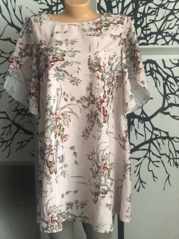Літня сукня,пляжна або міська сукня .Мягка та легка туніка.Пудрово-рожевого кольору,квітковий принт.Довжина 81см. .Рукав 29см.Пог 52см Пот 62см.Поб 71см