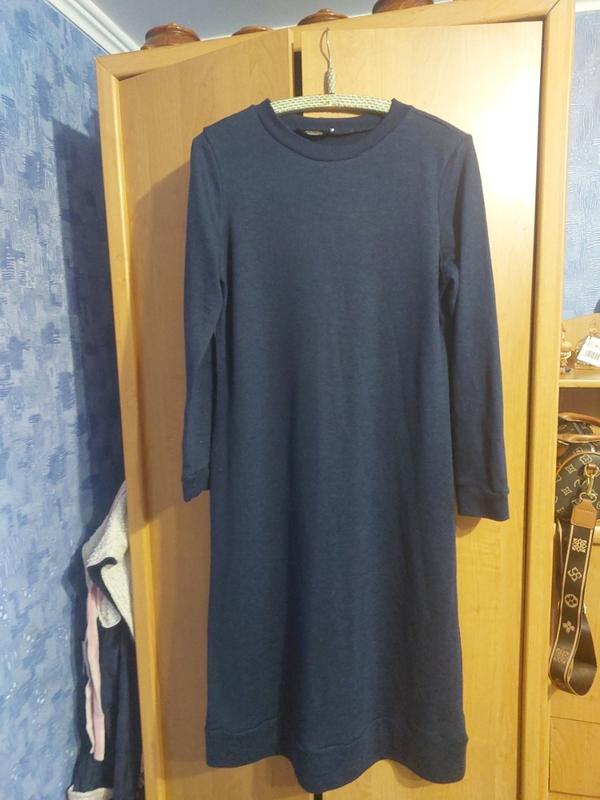 Платье темно-синего цвета с рукавами (длина рукавами 59 см), длина платья 109 см, объем груди полуобхват 51 см). Изделие хорошо тянется.