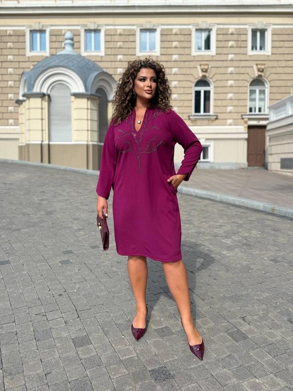 Платье Ткань трикотаж креп дайвинг Цвет черный, шоколадный, бордо Размер 48-50, 52-54,56-58 Отличное платье с карманами, из приятной к телу трикотажной, дышащей ткани. Украшено качественным термокамением. Цена: 750 грн