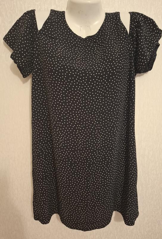 Платье-Туника New Look, черная в мелкий горох, искаженные отрезы рукавчики-фонарики на резинке,,суперово, сзади пуговица Размер:14(46/48) Плечи-32 Пог-50 Пот-52 Поб-56 Длина-81 Рукавчик-13 100%вискоза Morocco