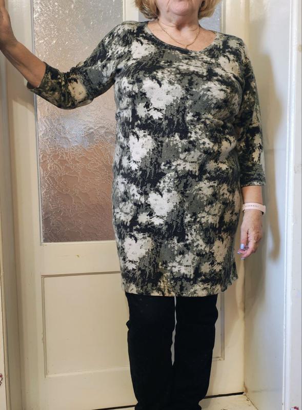 Платье-туника трикотажная, в сдержанном, мягком стиле с абстрактным принтом от TU. Прямой силуэт, без акцента на талии; комфортная, слегка свободная посадка Рукав 3/4, классической ширины Вырез круглый, аккуратный, без воротника. На спине сверху застежка из трех пуговиц. Выглядит более декоративно, чем функционально. Трикотаж с текстурной поверхностью - выглядит мягко, слегка фактурно, что добавляет глубины принта. Абстрактный флористически-камянистый мотив в оттенках оливкового, темно-зеленого, бежевого и белого. Рисунок напоминает размытые цветы или мягкую «акварельную» камуфляжную текстуру. Размер, указанный на наборе, 16, соответствующий международному L/XL. Длина 89 см. Ширина плечей - 39 см. Длина рукава (3/4) -45 см. НОГрудей - 50-54 см. Ширина по низу - 55 см. Имеет повседневный стиль, легко комбинируется с леггинсами, плотными колготами или узкими брюками. Туника имеет идеальное состояние, дефектов нет.