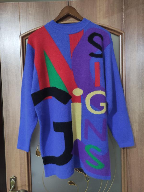 Винтажный шерстяной удлиненный свитер / туника. В идеале. Цвет - синий, лазурный + разноцветный. Удлиненный просторный фасон, линия плеча припущена. Размер указан М, подойдет на М, L, ориентируйтесь, пожалуйста, на замеры: длина от середины плеча до низа - 79 см., плечи - 51 см., рукав - 56 см., ПО под рукавами - 59 см., ПО по низу - 53 см. Яркий и теплый. Склад: 70% вовна, 20% ангора, 10% нейлон.
