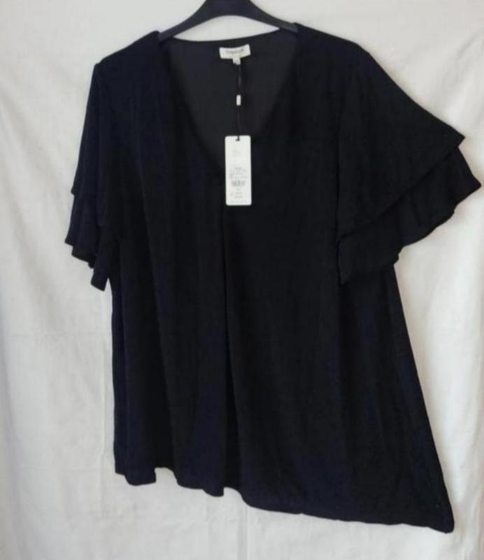 Шикарная туника вечерняя черного цвета, стрейчoва с вплетенной металлической нитью (люрекс), что очень украшает изделие; V-образный вырез, внизу которого заложена сборка; одна сторона асимметричный; рукав- двойной широкий волан; изделие на стрейчевом подкладе; из коллекции одежды для женщин Plus Size Studio 8 изысканного английского бренда вечерней женской одежды Phase Eight. Размер 76-26(60). Замеры: длина от 76 с одной стороны до 86 с более длинной; плечи-46; рукав-30; пот-72; поб - от 74; обхват низа - от 166. поскольку изделие стрейчевое, наблюдается хорошая растяжка.