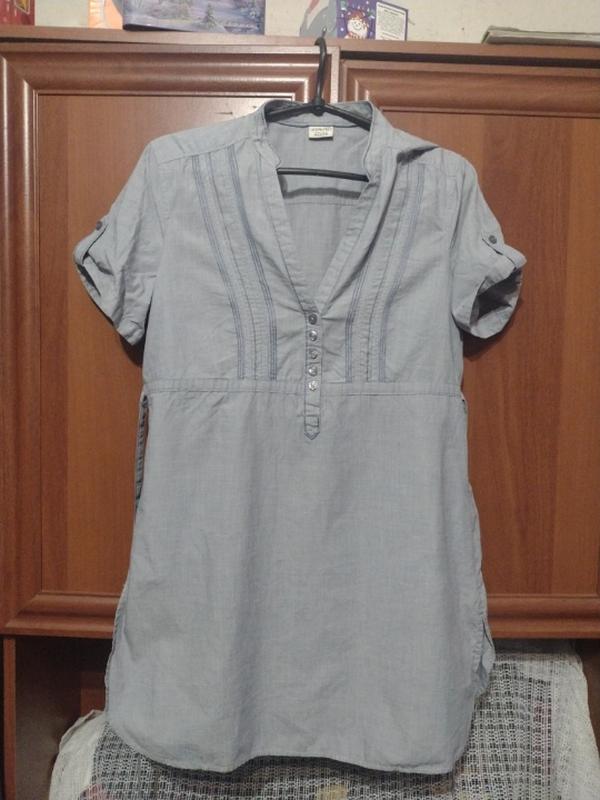 Платье-туника или рубашка-платье с короткими рукавами. Она имеет светло-серый или голубой оттенок денима/шамбре. Молния с правой стороны.