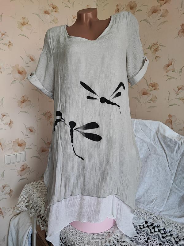 Двойное платье-туника из лёгкой жатой ткани (марлёвка) Размер: 16 Стильное и комфортное двойное платье-туника свободного кроя, идеально подходящее для тёплого сезона. Выполнено из лёгкой жатой ткани типа марлёвки — материал воздушный, дышащий, практически не требует глажки. Особенности модели: Двойной дизайн: верхний слой — полупрозрачный, нижний — контрастный, создаёт эффект многослойности Свободный силуэт, мягко ложится по фигуре, не сковывает движения Короткий рукав с аккуратным подворотом и декоративной пуговицей Округлый вырез горловины Оригинальный принт со стрекозами придаёт образу лёгкость и летнее настроение Асимметричный подол, удлинённая линия низа добавляет изящества. Цвет: светло-серый (дымчатый) с чёрным принтом Ткань: лёгкая, тонкая, жатая (марлёвка) Сезон: весна / лето Посадка: свободная, подходит для повседневной носки, отдыха, прогулок, поездок. Отличный вариант для тех, кто ценит комфорт, натуральную фактуру ткани и стильный, непринуждённый образ. Замеры на фото. Состояние новой вещи без бирки. Дефектов нет.