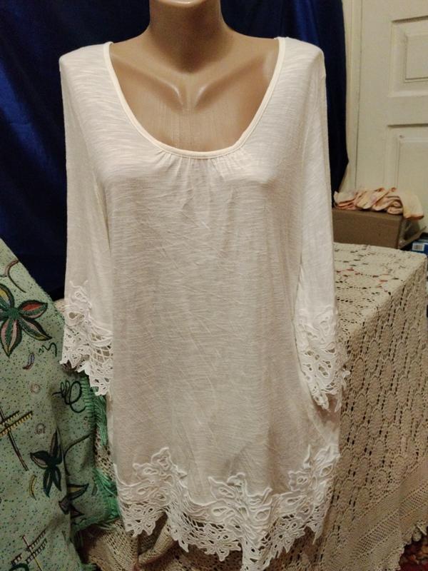очень красивая туника из отложной ажур.Ткань приятная к телу и хорошо тянется.Рощмир м,л,хл. опис состояние отлочный длина 83 рукав 46 ширина комди 50 ширина бедер 59