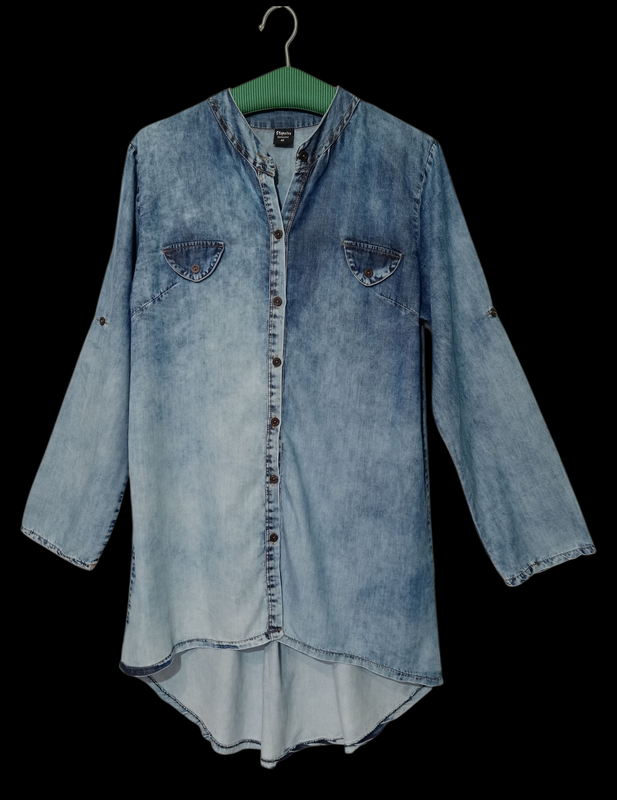 Стильная джинсовая туника свободного кроя. Выполнена из мягкого тонкого денима, комфортна в носке. Модель с воротником-стойкой, застёгивается на пуговицы. Накладные нагрудные карманы - это имитация. Рукава длинные, с возможностью подворота и фиксации. Ассиметричный удлинённый низ сзади красиво смотрится и хорошо садится по фигуре. Подходит для повседневной носки, можно сочетать с леггинсами, джинсами или носить как лёгкое платье-рубашку. Производитель Турция. Бирка о составе ткани отсутствует. Размер указан EUR 42. ✔️ плечи 41 ✔️ ПОГ 55 ✔️ ПОТ 53 ✔️ ПОБ 55 ✔️ длина рукава 61 ✔️ длина переда 79 ✔️ длина по спинке 98 Новое, без бумажной бирки.
