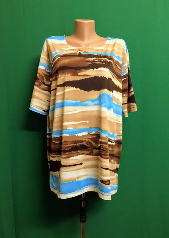 Туника Bexleys (Германия) - 92% Полиестер, 8% Эластан Указан размер XL(52/54) Ширина плеч 48 см Пройма 27 см Пог 64 см Пот 62 см Поб 64 см(по бокам разре по 9 см) Длина спинки 71 см Состояние новой вещи