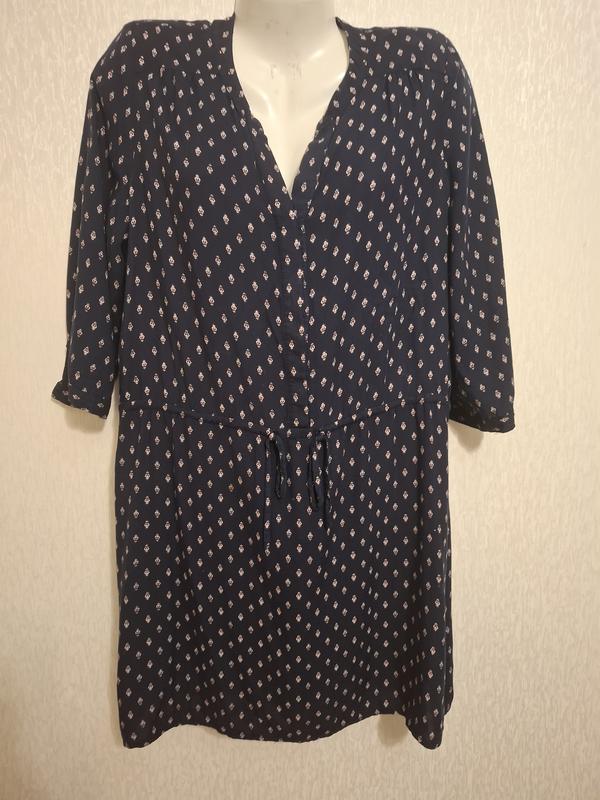 Платье-Туника George, темно-синий с мелкими фигурками,4шт пуговицы,V-образный вырез, тричетверты рукав с пуговицей,в талии шнуровка Размер:12(46/48) Плечи-40 Пог-57 Пот-52,шнуровка Поб-61 Длина-90 Рукав-44 коттон,вискоза Румыния