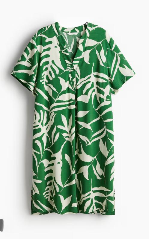 Платье-туника до колен из воздушной вискозной ткани с воротником-тасьмой и V-образным вырезом спереди. Свободный крой с плавно спущенными плечами, короткими рукавами и прямым подолом с разрезом с каждой стороны. Чуть длиннее сзади. Без подкладки. Плечи 42 ПОГ 60 Длина 96