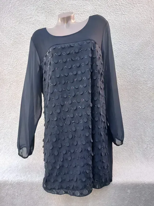 Черная интересная туника, шифоновый рукав на резиночке, наличие очень красивое ПО груди 60, ПО бедра 62, рукав 61, длина 85 Замеры отличия половина