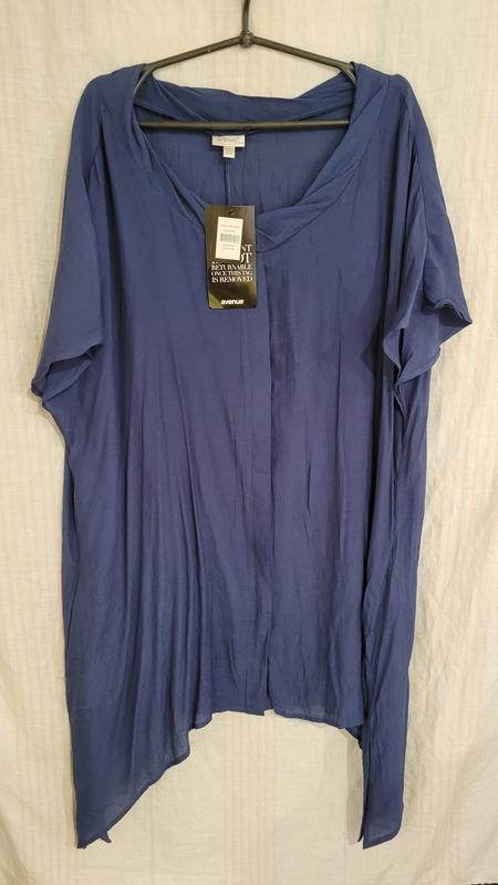 легкая блуза- туника с боковыми карманами ,расклешенная, пр бокам клинья с разрезами, рукав спущеный, цвет серосиний,ог 144, об 164, рукав от ворота 33, длина 91/110.