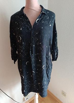 Платье - туника темно синего цвета, в принт ночное звездное небо. Размер 44. Замеры: ширина плеч 52, полуобхват груди 62, длина рукава 40, длина 90.