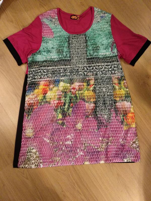 Туника Aprico,в оригинале выглядит намного лучше,чем на фото,цвет рукавов и половины спинки -фуксия,перед декорированный сеткой ,состояние идеальное, без дефектов,размер 52-54.