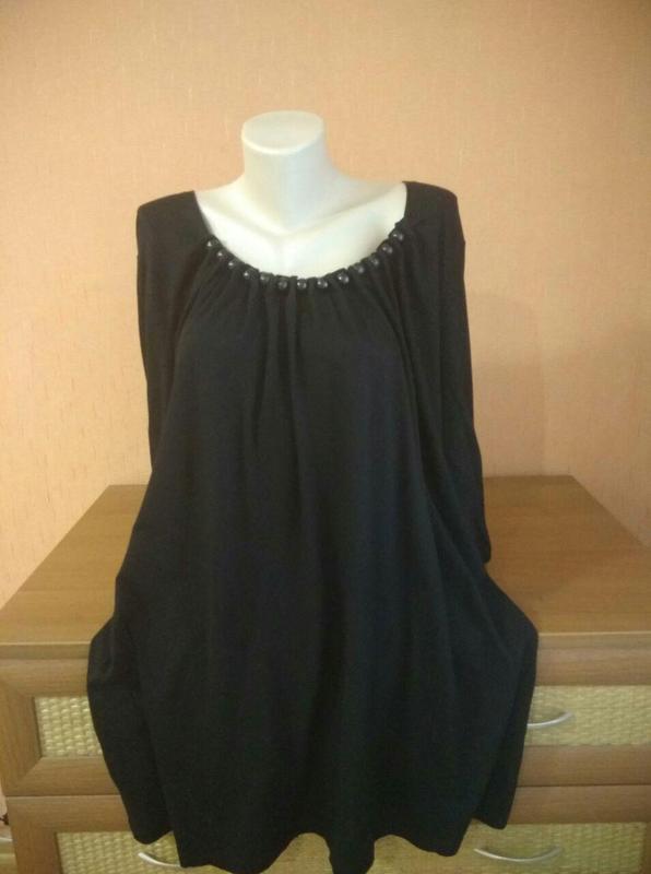 Туника, спереди горловина обшита большими бусинами. Вискоза. Размер: 48/50 евро, на наш 54/56, см. замеры: Длина - 87 см, длина рукава от плеча - 52 см, от горловины - 62 см, ПОГ - 69 см, Полуобхват низа - 75 см, Біцепс - 20 см.