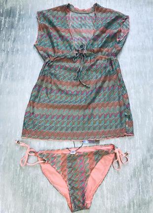 Собранный кружевной пляжный комплект , туника и плавки бикини . Туника размер указан S . Длина изделия 83 см, ПОГ 54 см, пот 49 см, ПОБ 56 см , все замеры не в натяжку тянется. Плавки на подкладке с завязками . Новые Размер указан 12/16 . ПОТ 40 можно и больше до 44 , посадка сзади 23 см, спереди 28 см