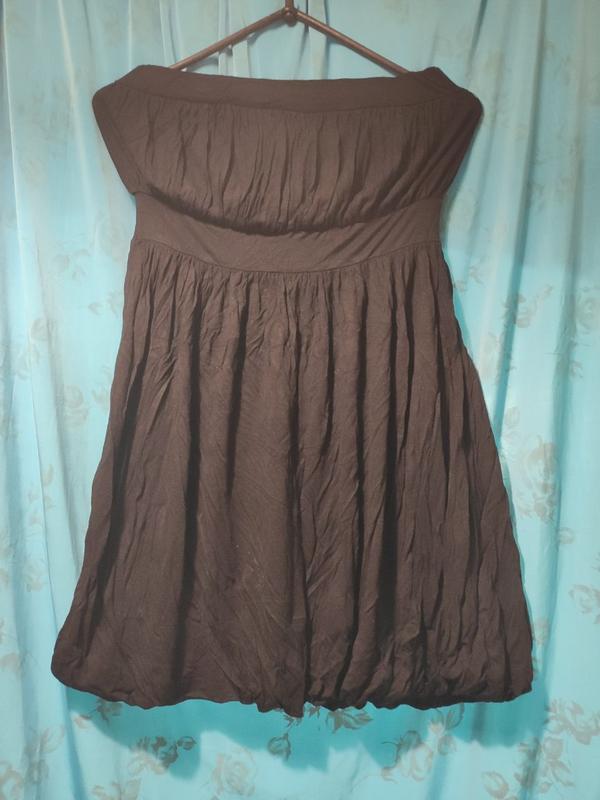 Стильне плаття-туніка без бретелей. Розміри в смна фото. "Спідничка" починається від грудей. Подвійна тканина, по низу з'єднання єднані два шарі, резиночка зверху і знизу плаття. Трошки пошкоджений ярличок.