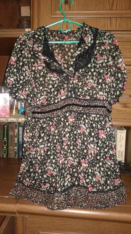 состав полиестр полупрозрачное платье туника. До пояса впереди на пуговицах ,рукав короткий тоже на поновке ,имеются вставки черного кружева состояние отличное можно носить под поясок Замеры длина 75. плечи 38 полуокружность груди 46 талии 44 им по бёдрам 50 Носилось под лосины на 44 размер