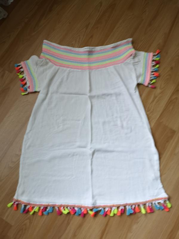 Шикарная туника с яркой отделкой, плечи спущены на резинке 43 см, ширина 10 см, длина 75 см с бахромой, рукав 15 см с бахромой, подмышки 53 см, низ 63 см , ткань лёгкая пружинящая, вещь новая без бирок.