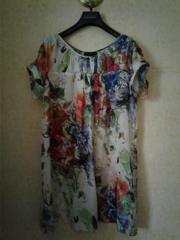 Состояние без нюансов Вырез лодочка Есть боковые петельки для пояса , которые допустимо срезать,пояс уткрян Универсальное - идеально , как мини платье , пляжная туника , туника под шорты или брюки Хорошо сядет на 10 - 12 размер Длина 81 Пог 60. Замер без растягивания драпировки
