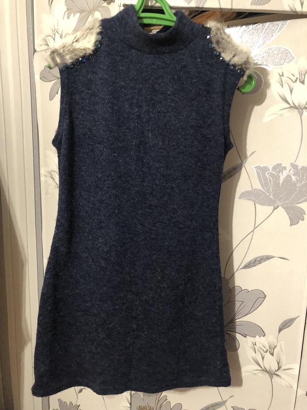 Туника с ангорой и на плечах мех кролика с отделкой из камушек, оригинальная и теплая