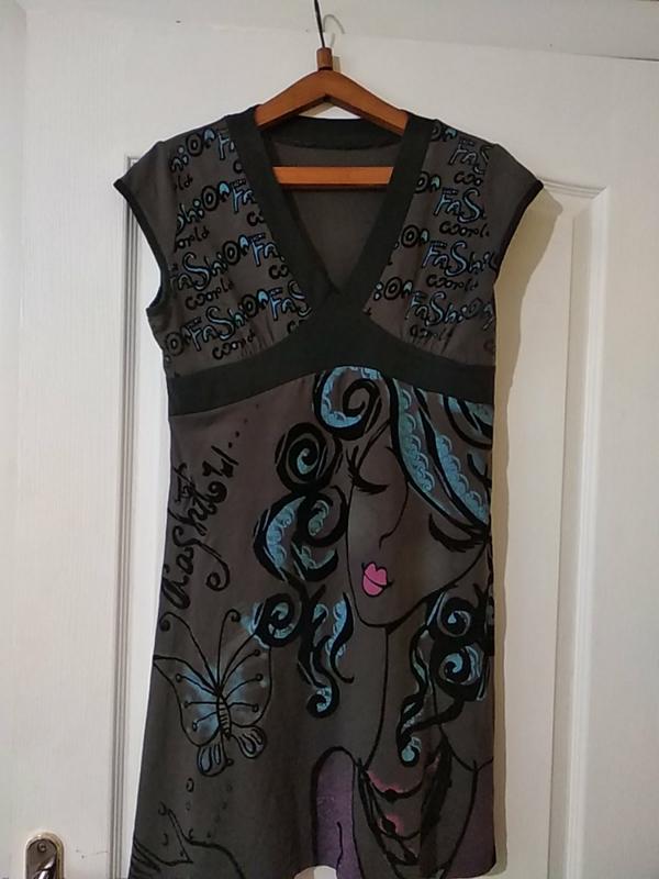 Матеріал стрейч-котон.Прикрашена туніка малюнком з велюру.Дуже незвичайна річ.V-подібний виріз прикрашає і підкреслює груди. Бирочек не збереглося. пог-46 піт-46 побіди-60 довжина-88