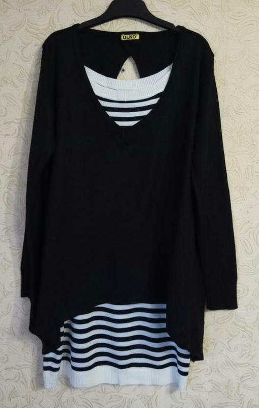 Двойка:туника и сарафан 46-50 р-ру.Туника черного цвета,А - силуэта, ассиметричной формы, с v - образным вырезом спереди и большим вырезом сзади спины (фото 1,2,5), что очень красиво смотрится.Сарафан идет на тонких брителях(фото 4). Замеры: сарафан - об.грудей 46/50 см.; длиною.производителя 84 см; туника - плечи 40 см; рукав от горла 60 см; об.грудей 58 см.; стегна 69 см.; довж.виробу 63/77 см. Перешлю после 100% оплаты на карточку. Отправлю Новой или Укр.почтой. По дополнительной информации обратитесь. Смотрите мое другое объявления.