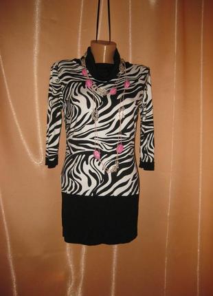 Эластичное платье туника закрыто под горло S , км0770 гольф водолазка черное с белым, с животным принтом, Состояние хорошее – нет повреждений, нет разрывов, нет пятен, ткань хорошо тянется Замеры в не растянутом состоянии: ПО подмышками 47 см, ПО талии 40 см, ПО бедра по резинке по шву 41 см, длина от шва на горле 66 см, длина резинки снизу 17 см. "если вас интересует какая-то вещь, но есть сомнения или вопросы, то пишите. стараюсь всем ответить. смотрите все объявления. при покупке двух (сразу или на протяжении месяца) или более вещей возможны скидки до целых 20-50%!! "