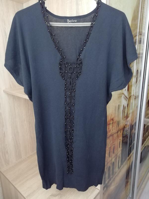 Красивая туника, Италия, размер 48-50.Украшена бусинками и кружевом по всей длине. Длина от плеча 80см.Состояние идеальное