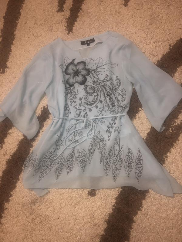 Красивая туника, маечка одевается под низ и есть поясочек. На размер М-Л. Есть нюанс, небольшое пятнышко, которое вообще незаметно