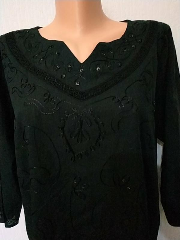 Тонкое, летнее платье, насыщенного черного цвета. Спереди розшито черной шелковой нитью и слегка украшено паетками. По бок.шву разрезы длиной 28см. Длина по центру спинки 89см, длина рукава 43см, ширина плеча 11см, ширина по низу рукава 16см, ширина по низу проймы 57см, ширина по низу 61см.