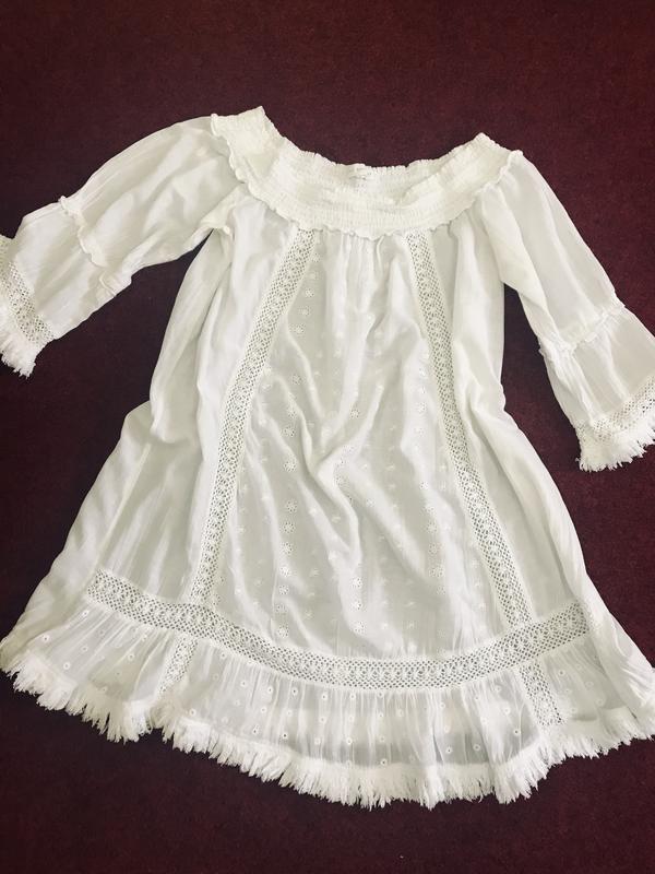 Белоснежное платье/туника , горловина резинка . Свободный крой. размер указан 38 большемерит , подойдёт до 46 Next Длина изделия 87 см, рукав от ворота 46 см, ПОГ 60 см, ПОТ 70 см, ПОБ 79 см, Состав: Котон
