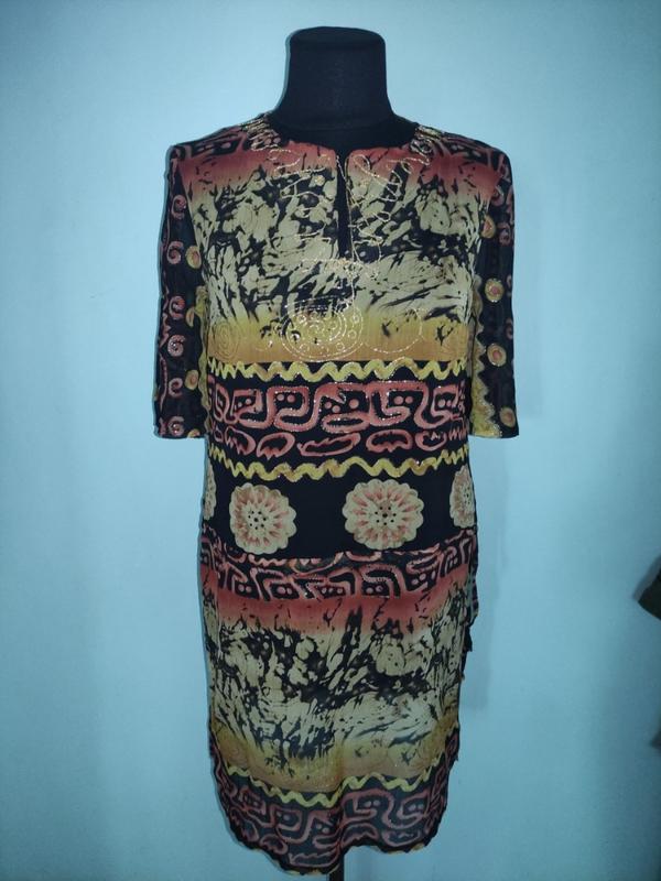 Очень красивая ,лёгкая, приятная к телу вещь. Распмсанная "золотом". Прямого силуэта. По бокам разрезы. По линии "заниженной талии"-кулиска, за счёт этого, можно регулировать силуэт (либо прямой, либо с напуском). На рукавах-разрезы. Р.38. Длина по спинке-91, длина рукава-34, Пог-52, Пот-52, Поб-55(разрезы)