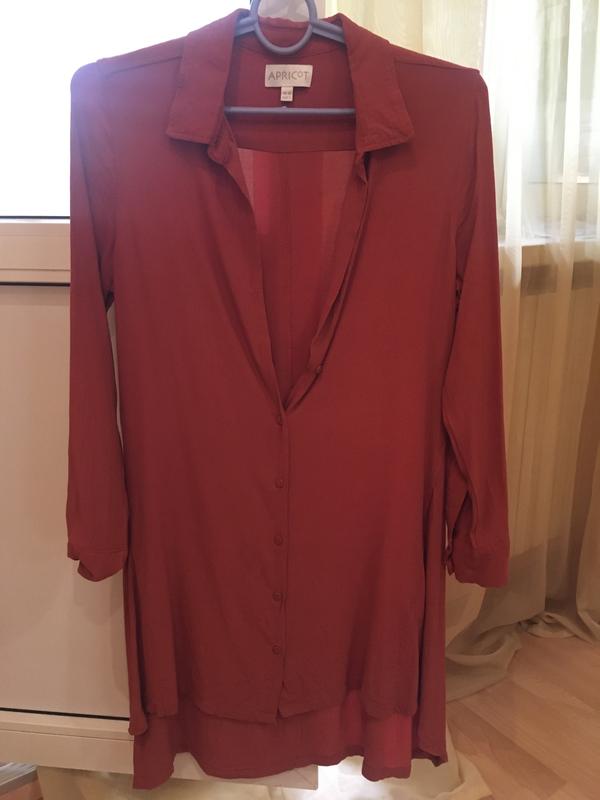 Необычайно красивая и приятная к телу, 100% вискоза. Длина спереди 74, сзади 88. В груди 45. Рукав подворачивается. Фасон немного расширенный книзу, очень красиво ложится по силуэту . Новая, сток. Цвет кирпичный.